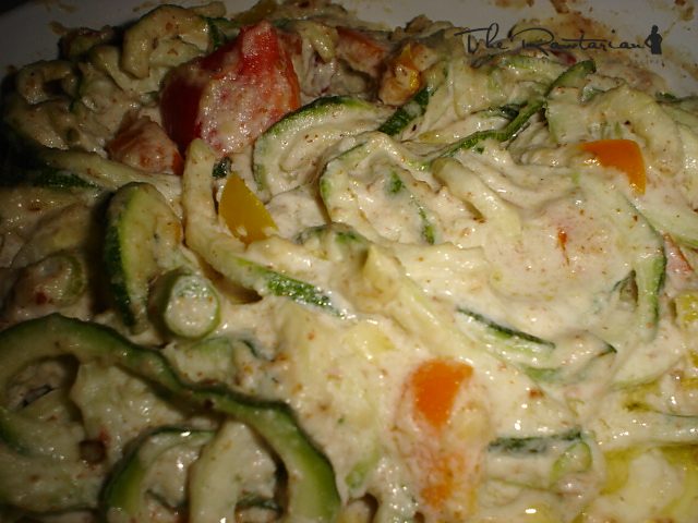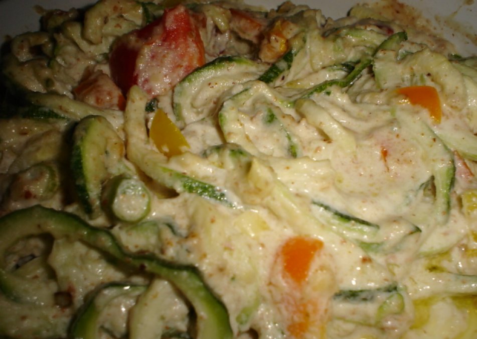 Wow! This tastes great. I can't handle cashews. Seems like they are in anything creamy. I shredded some daikon, carrot, zucchini, brocolli stem, sliced a scallion, chopped some broccoli crowns and a little bit of tomato. I put some of that sauce on it and topped it with tomatoes...so good. I was marinating/dehdrating bell pepper halves to stuff them...but this was soo good I couldn't wait. Yippe!