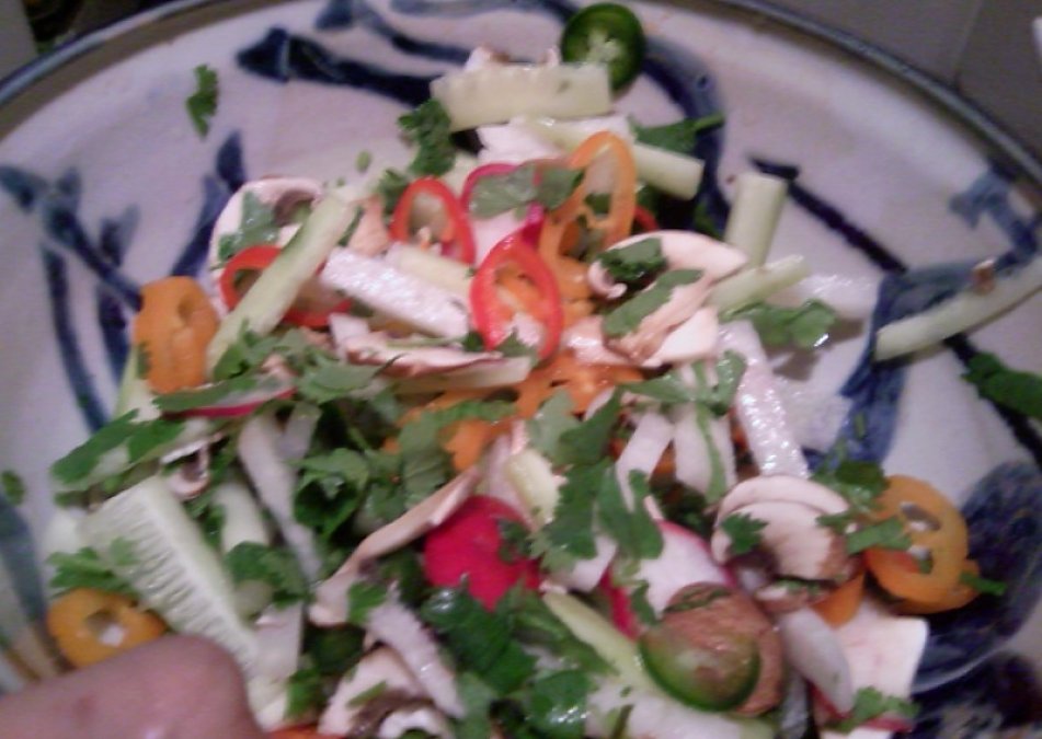 Preparation: Slice the cucumber and jicama into matchsticks. Slice the mushrooms and radishes very thin. Cut the mini sweet peppers and jalepenos into small rings. Chop the cilantro. Place all vegetable ingredients in bowl. Squeeze the lemon and lime into the bowl. Add the venegar and olive oil. Toss the vegetables around and allow to marinate for 20-30 minutes.