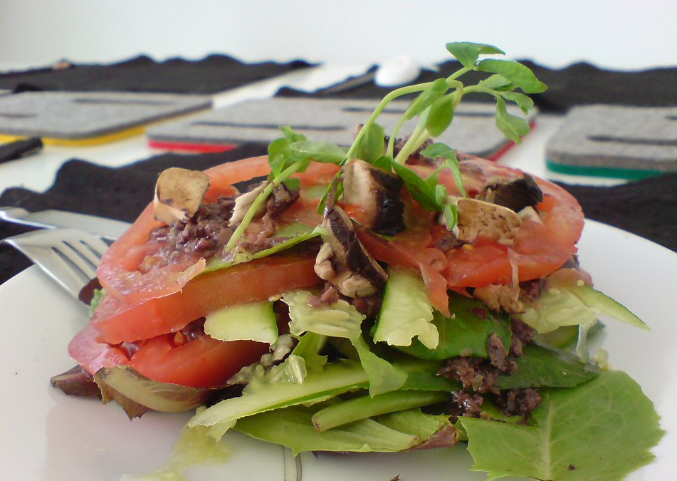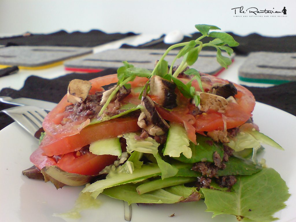 1. Stack anyway you like really. Make a pattern: mesclun, thin cucumber, olives, tomato, repeat. Always dry ingredients at the bottom and fill the olives in the middle and you get this kick of Greekish taste.