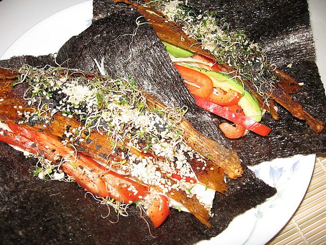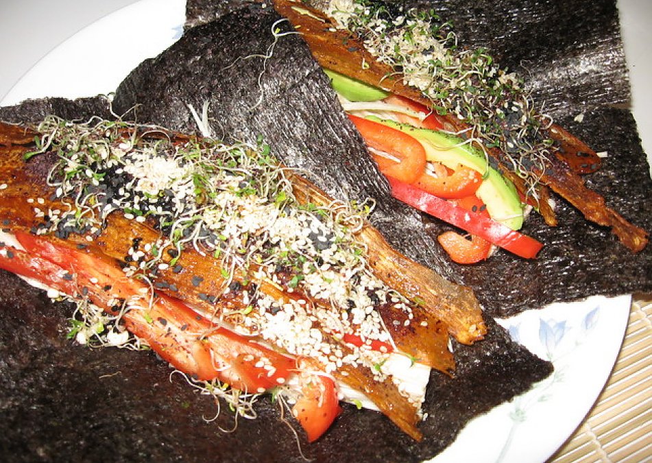 "Raw bacon" is eggplant, peeled and sliced very thinnly with a vegetable peeler. Marinate it in olive oil, ume plum vinegar, agave or maple syrup, and spices (paprika, cayenne, black pepper). Then dehydrate until dry and chewy. There is a recipe for it on Goneraw, just search "raw bacon" and you should find it. I make mine a little different each time.