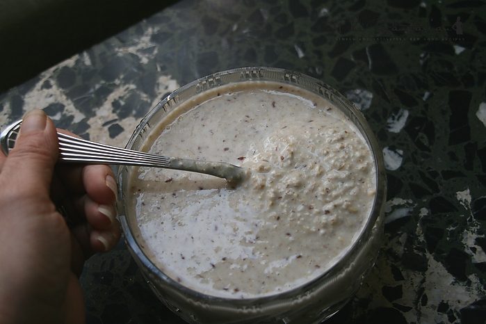 after the oats have been soaked overnight and are nice and soft, blend them thoroughly with at least one cup of water, scrape the escapees off the side a few times, give it a really good blast on a good high speed, if you have a vitamix your set already. when its nice and creamy pour/scrape into a bowl and mix in the flax seed. cover and let sit at room temperature for a few hours, the flax goes nice and slippy to replicate the cooked oat slippy texture. when you are ready to eat decide if you are going the sweet sweet agave route, or the icky salt route, and add your desired sweet/salty choice. give it a good stir