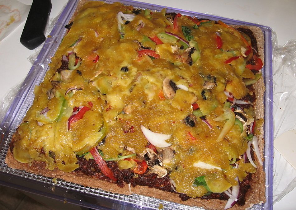 I like to use the cheese recipe from this pizza recipe for my pizza. After my bf expressed his preference for a thin crust, I started using a flax cracker or tortilla recipe for the crust--it's much easier and holds together better than the crust here. I just dry the cracker/tortilla until pretty dry on both sides, and put on the sauce and cheese and dehydrate all of it together; it works pretty well. And I skip the dates in the sauce. Blech.