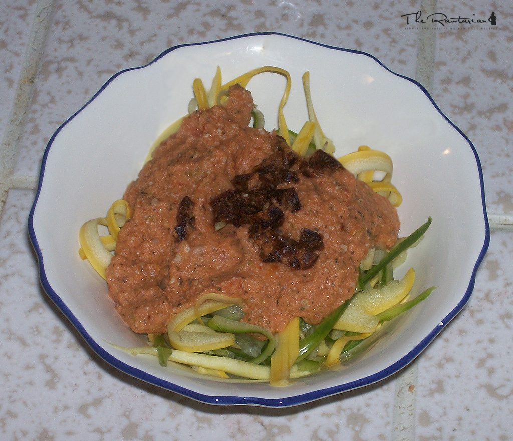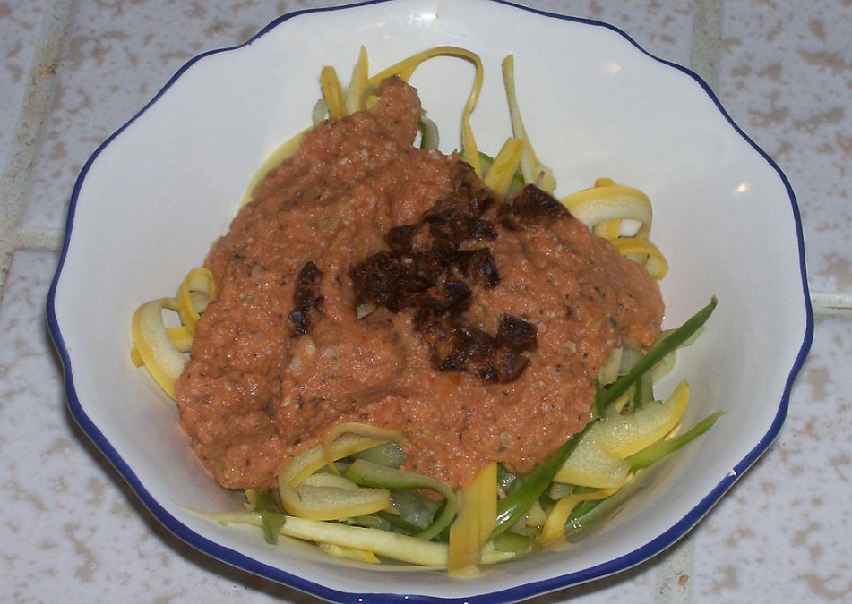 Roughly chop tomato, garlic, bell pepper, and onion and place in blender. Mince sun dried tomato and toss in blender, as well. Blend on low until it starts moving (you may have to push it down once or twice, but it will go fine after a minute). Add in olive oil and italian seasonings, continue to blend on low. If you want to add the sunflower seeds, toss them in with the salt (they are totally optional but add protein, a few calories, and a parmesan taste!). Flip blender up to high and puree another 20 seconds or so. Pour sauce over bowl of 'noodles', toss together, and serve!