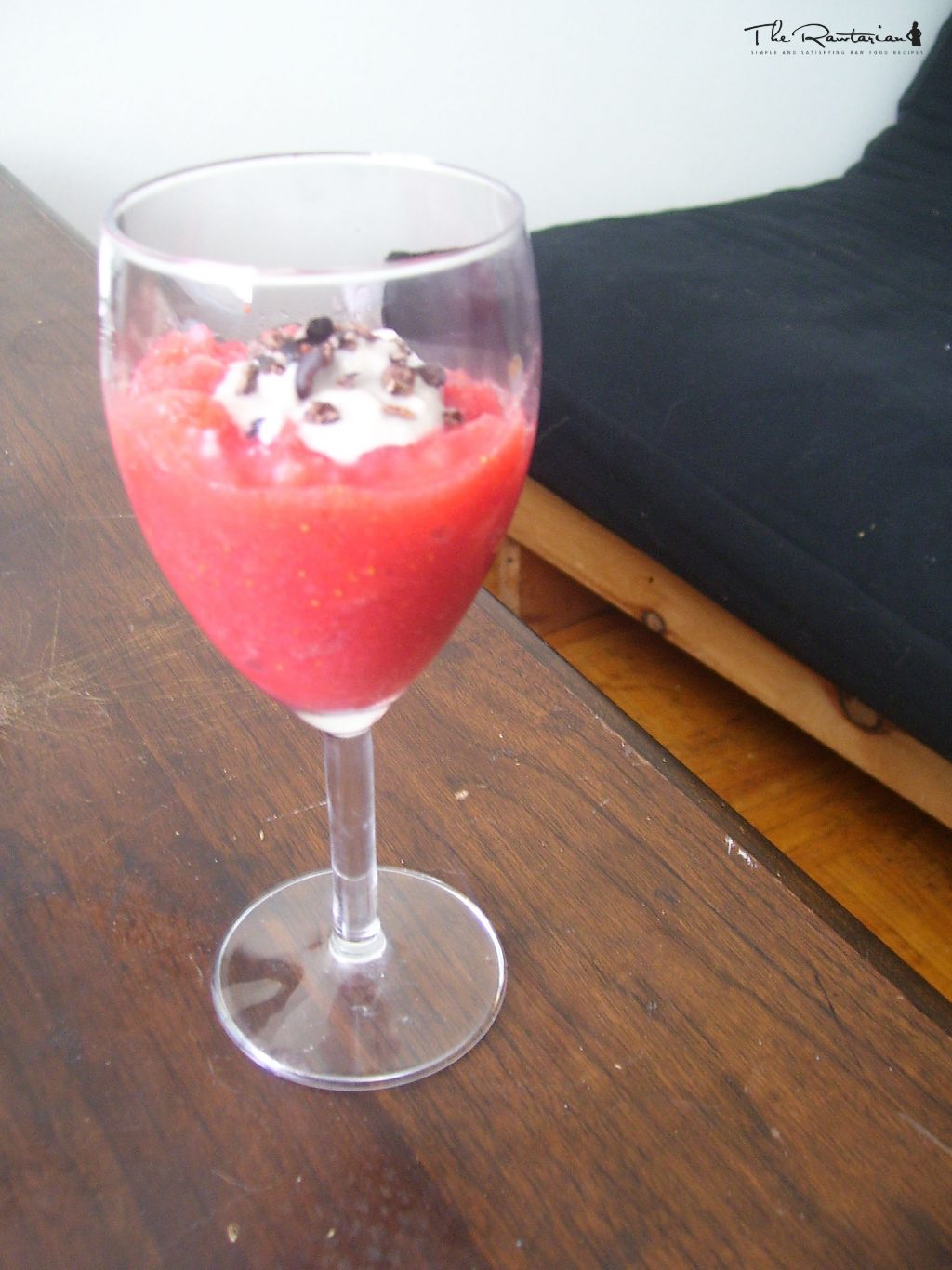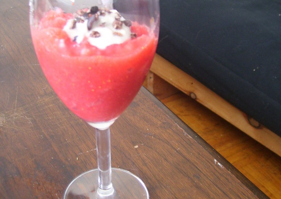This is a very tasty refreshing desert, and it’s so easy. You can really substitute any fruit you like. I just had strawberries on hand and they seemed to work very well. It is really good when topped with banana cream. I also threw on a few cacao nibs as a garnish.