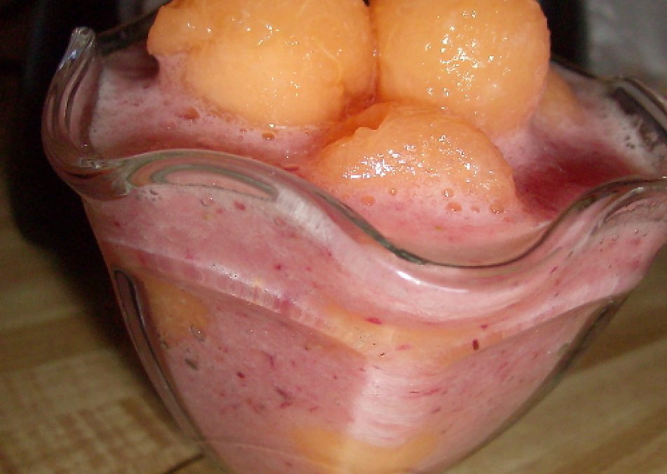 Blend bananas, strawberries, half of the cantaloupe & ice.