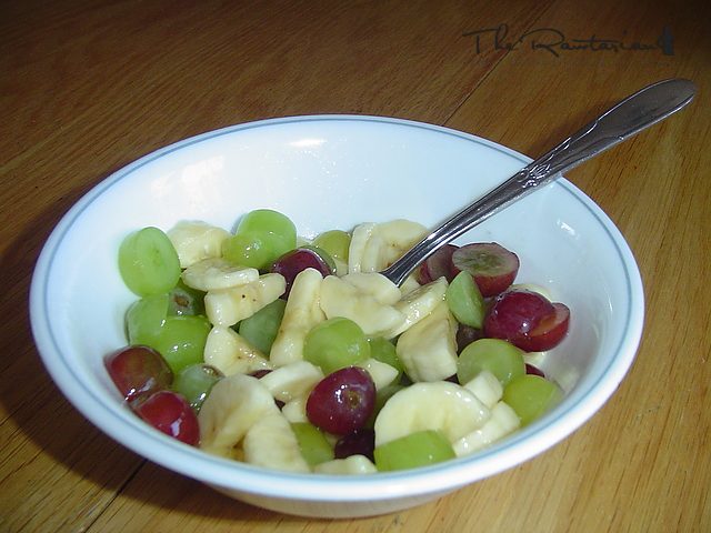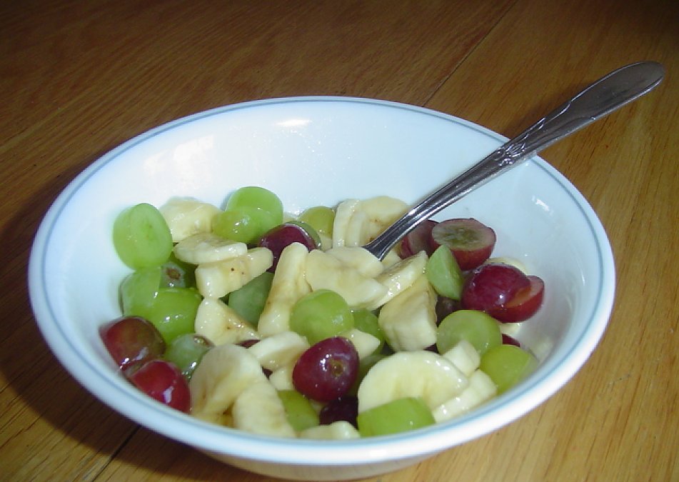 I love fruit salad! I came up with this recipe one day. It combines my two favorite foods: bananas and grapes! I used half red and half green for variety. It looks great too!