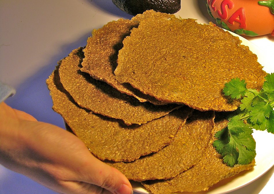 I'm only a few weeks into the raw diet so pardon my newness. I couldn't wait for a reply so I went ahead and soaked my flax and used 1 cup of soaked flax instead of dry. I'm glad I did. I have used dry flax for another cracker recipe and I didn't like how it stuck to my teeth! That didn't happen with these. I am not a spicey food lover, so I cut the cayenne in half and it was still too spicy for me. But other than my own personal inability to tolerate spicy heat I thought these were great! I dehydrated to the tortilla stage just to test one out with salad fillings off my dinner plate, ate it, loved it, and then dehydrated the rest completely to the crunchy chip state, which are now on my desk at work (with a bottle of water to cool off my mouth!!). I will be making these over and over again with soaked flax and just a pinch of cayenne. They are winners with my whole SAD family, except my husband who refuses to eat any raw food or even a cooked vegetable for that matter. Thanks for the recipe!