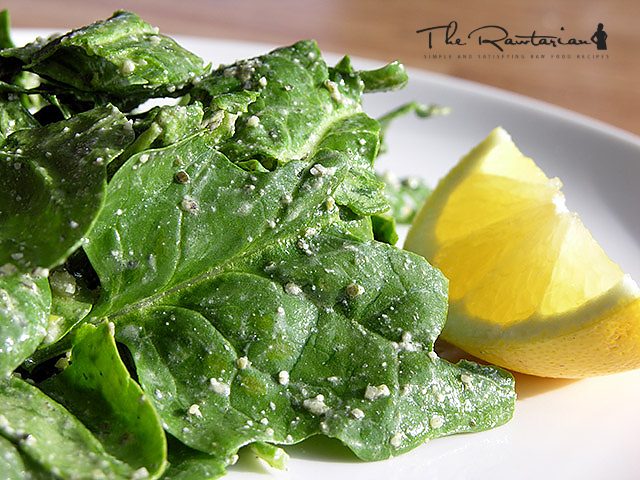I have been craving a caesar salad and I happened to have some lovely spinach! I made this with a little braggs. I also used some Rawmesan instead of pumpkin seeds.