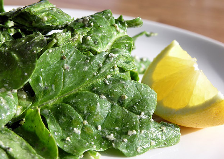 5. In a small bowl, blend 1 or 2 pressed cloves of garlic, lemon juice, Dijon mustard, olive oil, a sprinkle of white pepper and Celtic sea salt. Pour over the spinach and toss well.