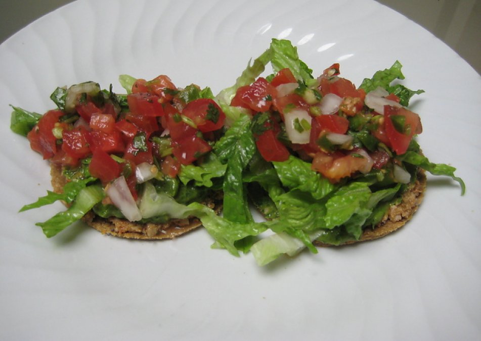 5. The tostada goes like this: tostada, smear with refried beans, then spinach topping, shredded lettuce and pico de gallo.