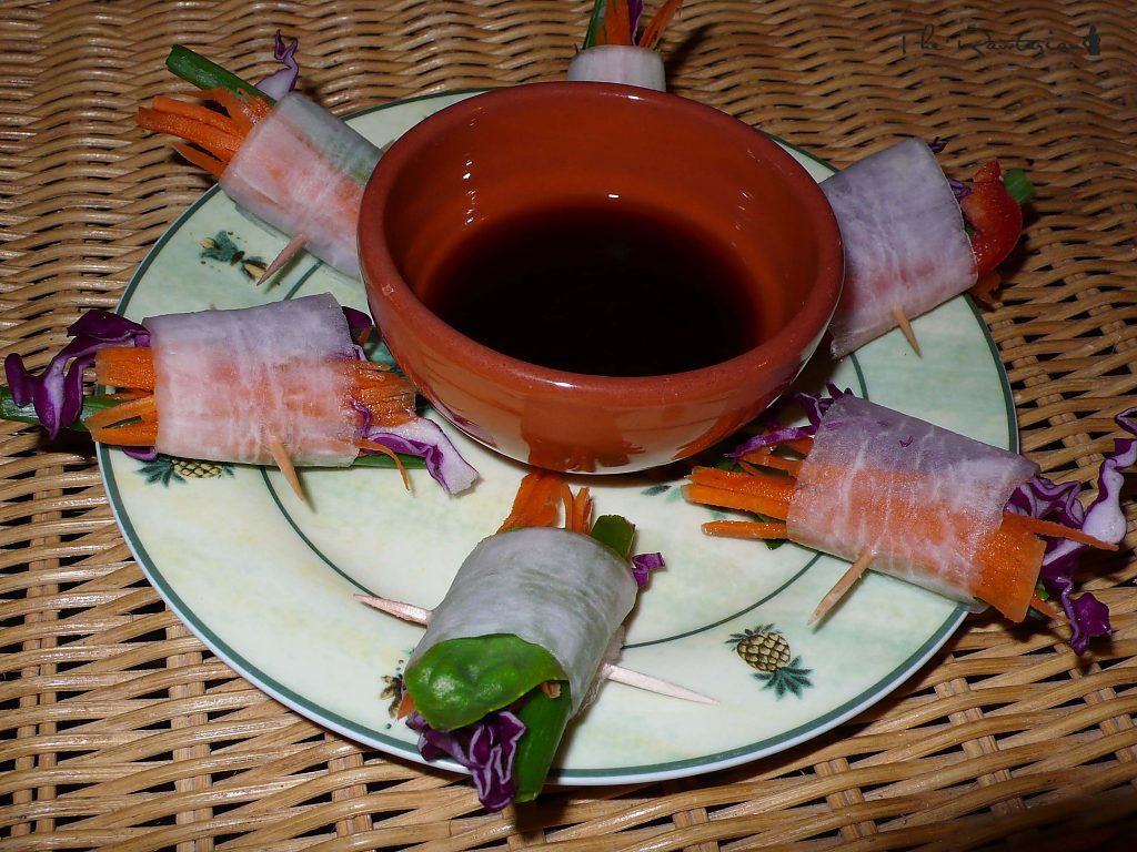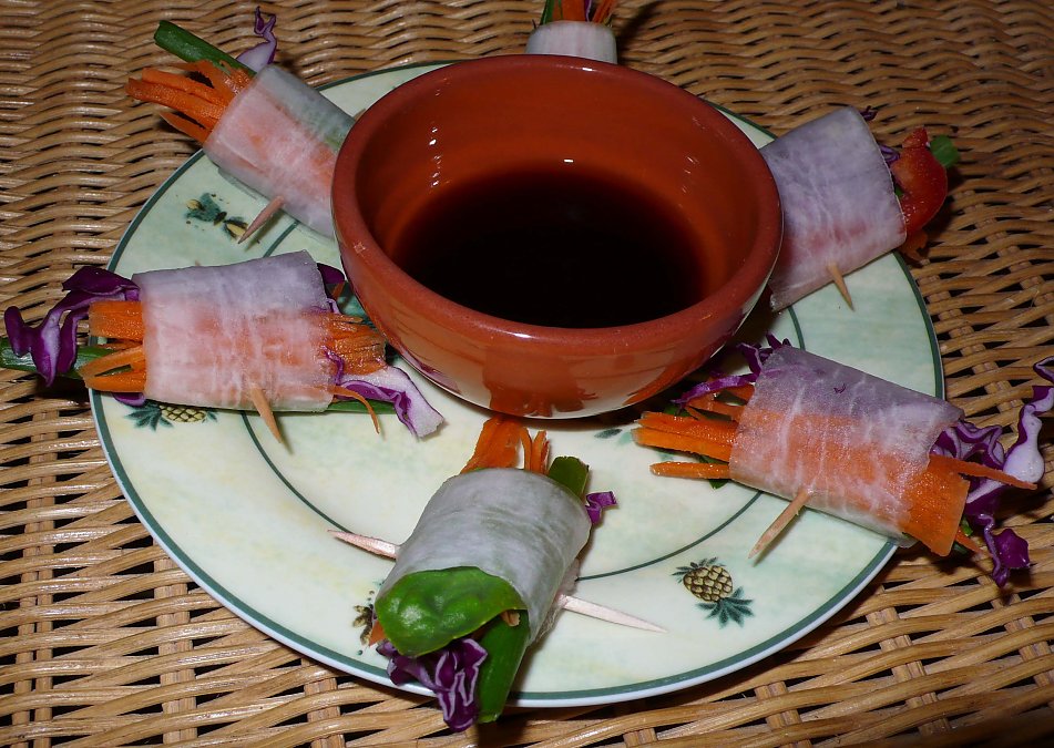 Cut the daikon to a length suitable for rolling. Slice daikon with vegetable peeler into paper-thin strips. Add strips of veggies crosswise across the daikon slices, allowing some to hang over. Roll the daikon and pin in place with a toothpick. Mix the soy sauce, vinegar, and agave together to make a dipping sauce. I think this would have been even better with some chopped hot pepper for some spice. Have fun playing around with different veggies. Cucumber and red pepper would be great.