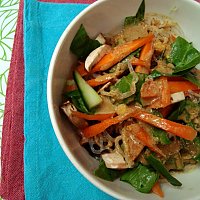 Place the noodles onto plates. Mix everything else together and serve on top of the noodles. Top with a sprinkling of sesame seeds and a little fresh parsley or coriander.
