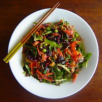Soak the arame in warm water for about 10-15 minutes (or until soft). You can leave it soak while you prepare the rest of the dish. Drain and rinse the arame, put into a bowl and stir in the remaining ingredients and allow to marinate for at least 20 minutes. Keeps for about 2 days in the fridge in a lidded container.