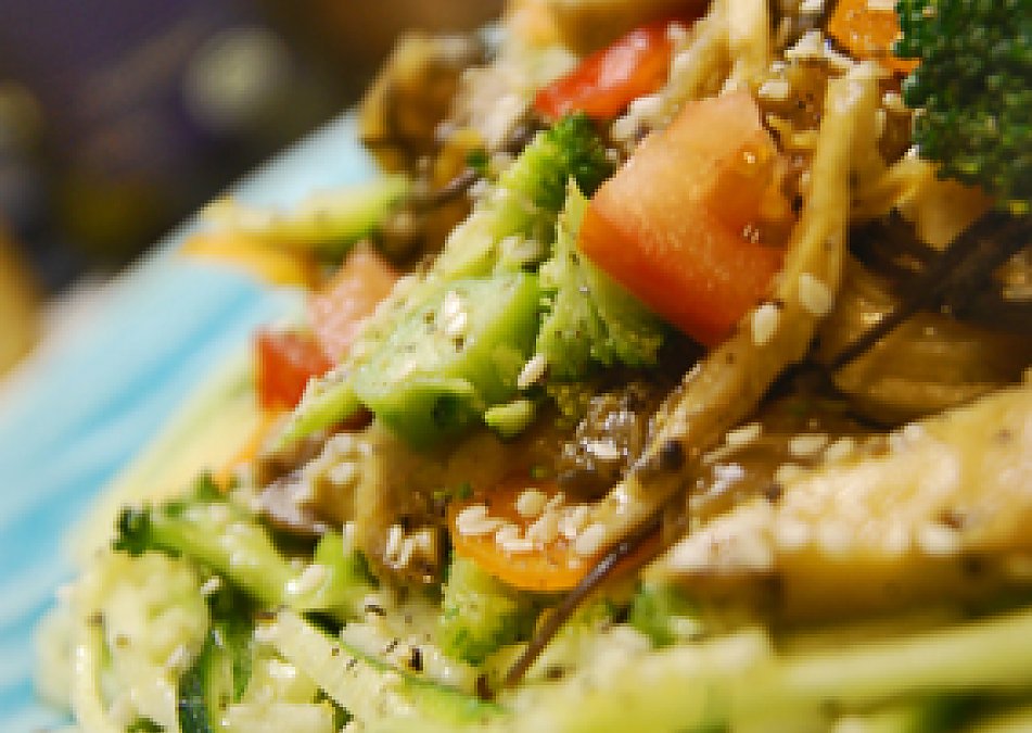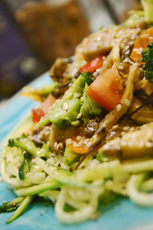 By Miss_Best A yummy and energizing entree, perfect for a weekend dinner or lunch! It's a bit of a bonus recipe, because you can use the various components in other dishes. Marinated mushrooms, for example, make an exceedingly good addition to salads or sushi (or nori rolls). The marinated broccoli makes a great side-dish or snack, and the marinated arame makes for a yummy way to include more mineral rich, cleansing seaweed into your beautiful body. The courgette (zucchini) noodles are fantastic in salads, or eaten instead of spaghetti or egg noodles.
