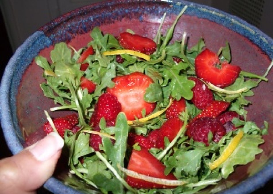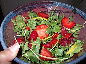 By Blissful Mother The sweet tart beautiful strawberry compliments the peppery arugula in this salad. There is also lemon zest and raspberries for a nice tart flavor. All together with the dressing it is a wonderful adventure for your senses!