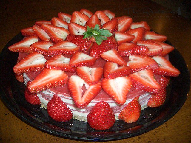 6. Assemble the cake in 4 layers on top of the crust. Spread half the white mixture over the crust, followed with half of the strawberry mixture.