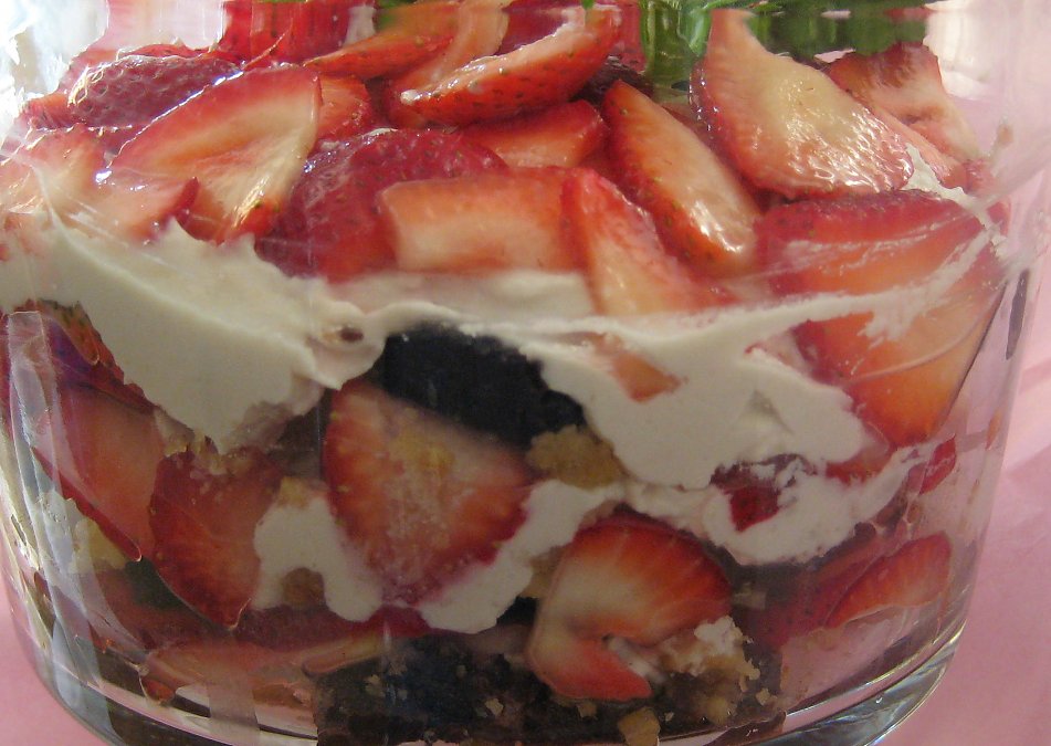8. In the bottom of a trifle bowl, place brownie squares, top with coconut cream, and then with sliced strawberries.