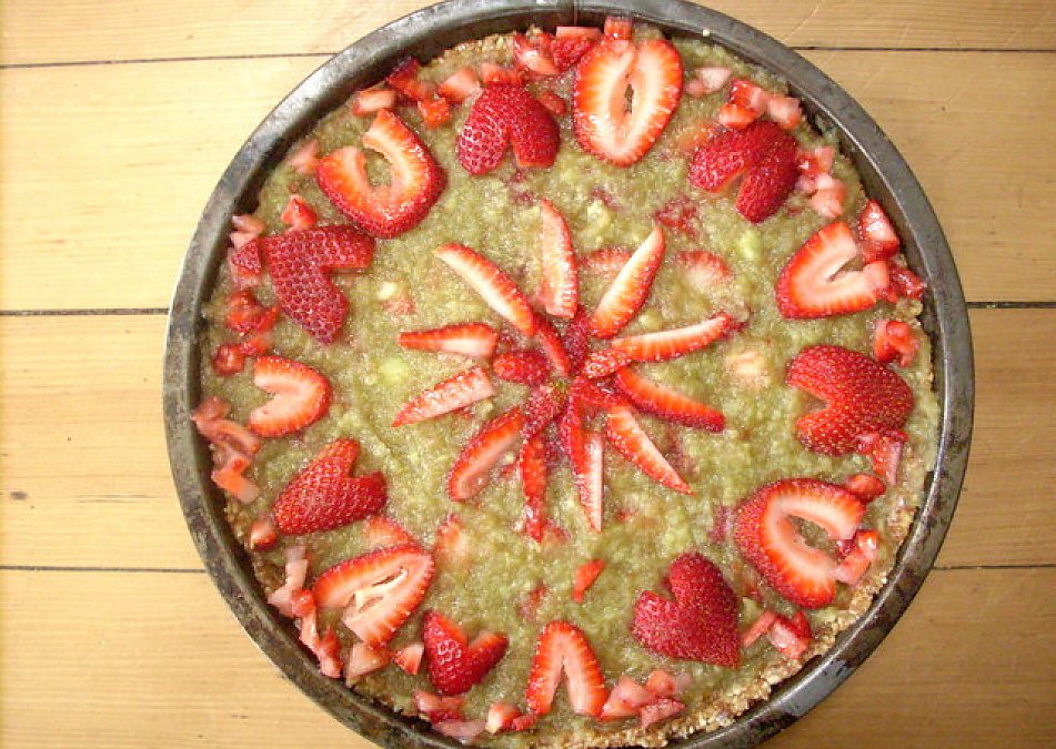 YUM! I have this in my fridge right now...I keep sneaking little slivers! Even my non-raw dad LOVED it. He even liked the crust...asked what was in it and couldn't believe there were dates! haha...he normally hates dates! I didn't have any psyllium powder so I just heated up some agar-agar in some water and juice from the rhubarb, let it cool and mixed it in instead. So it's not 100% raw, I guess. I can't wait for my rhubarb plant to start growing more stalks!