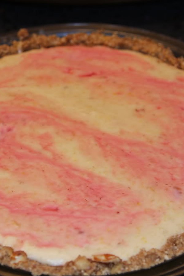 6. Pour half the filling into the pie crust, then add about 1/4 of the strawberry topping mixture in the middle of the pie.