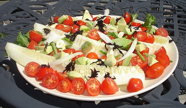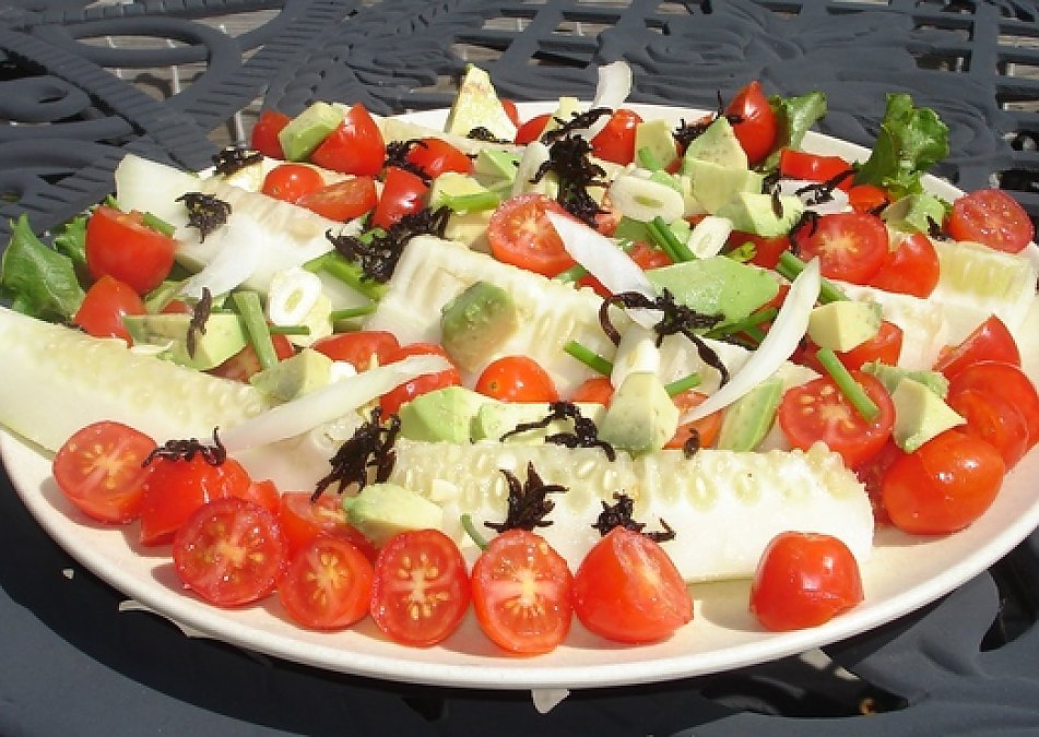 I placed the lettuce first on the plate and then sliced the cucumbers, tomatoes, onion, garlic, avocado and chives. I drizzled a little bit of olive oil and sprinkled some hiziki seaweed and sea salt.