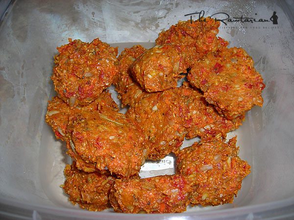 These are really good on top of salads!!!!!! I've been making them often lately. Here is what I do: Finely chop up the pepper, celery, carrots; add the flax meal to the chopped veggies; blend the remaining ingredients in the vitamix into a pate; then mix all together.