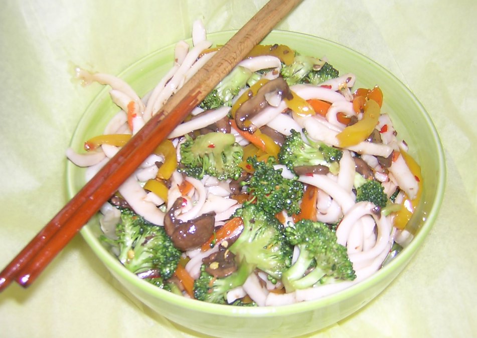 2. Toss marinated vegetables with noodles and olive oil, sesame oil, and salt until well coated.