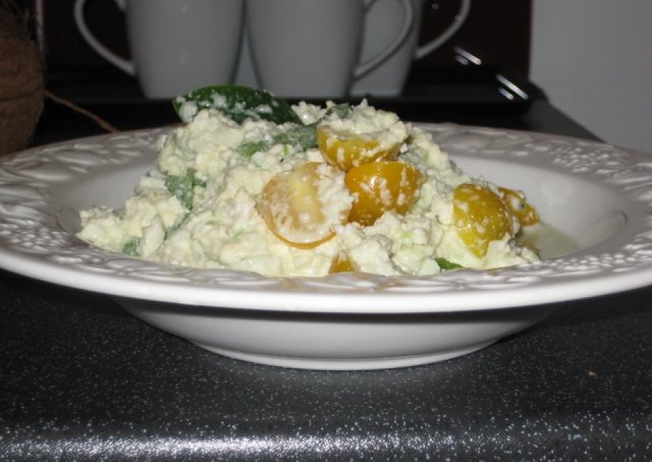 Add all the ingredients except the tomatoes and half the green pepper to the blender and whizz for a minute or so. Pour this sauce on the cauliflower and mix in.