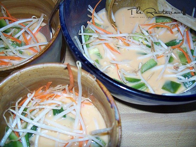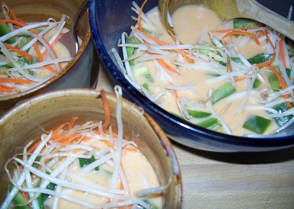 Mix Lemon Juice, curry spice combination, Water, and Coconut Milk. Add the cut vegetables, Mung Bean Sprouts, and Basil Leaves. Allow soup to chill for 15-30 minutes. If coconut milk thickens beyond desired consistancy while chilling, slowly stir in a bit more water to thin.