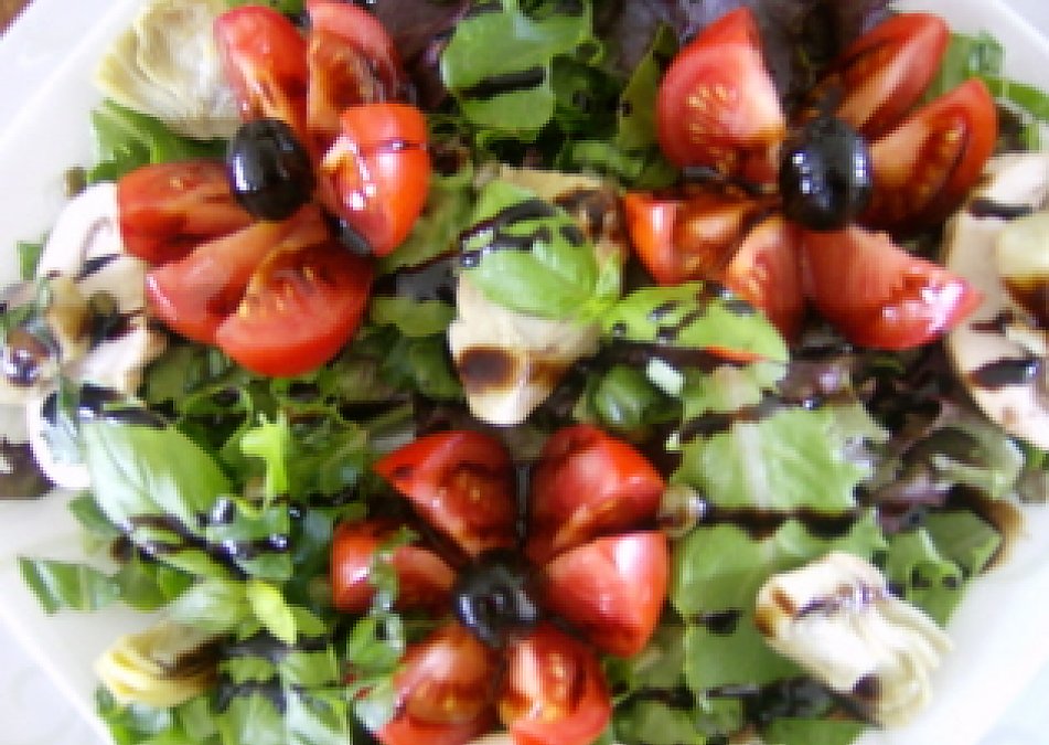 2. Cut tomatoes into 6 petals, leaving stem end slightly intact.place on salad with olive as centre.