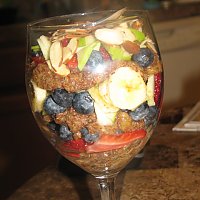 Splendid parfait! For a chocolate sauce, use agave, cacao powder, sliced strawberries, and almond flour sprinkled on top.