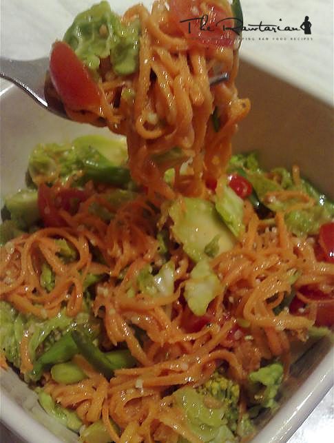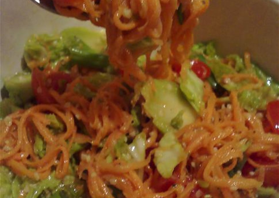 I just got my spiral cutter and only had a yam on hand, so this was fun and easy. I added some sesame oil, cilantro, and black sesame seeds to mine. It was very pretty.