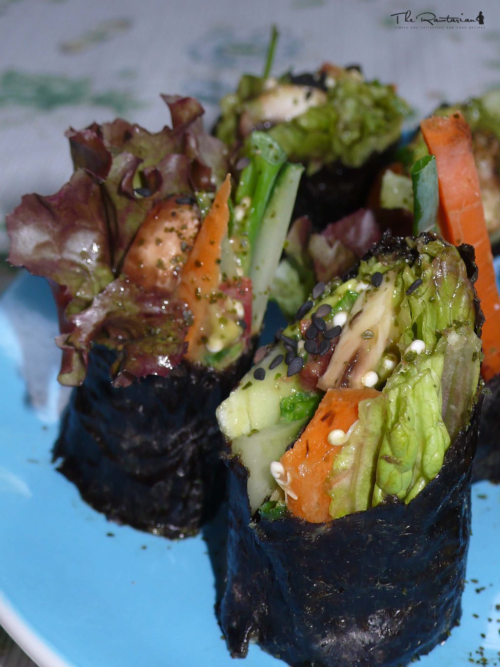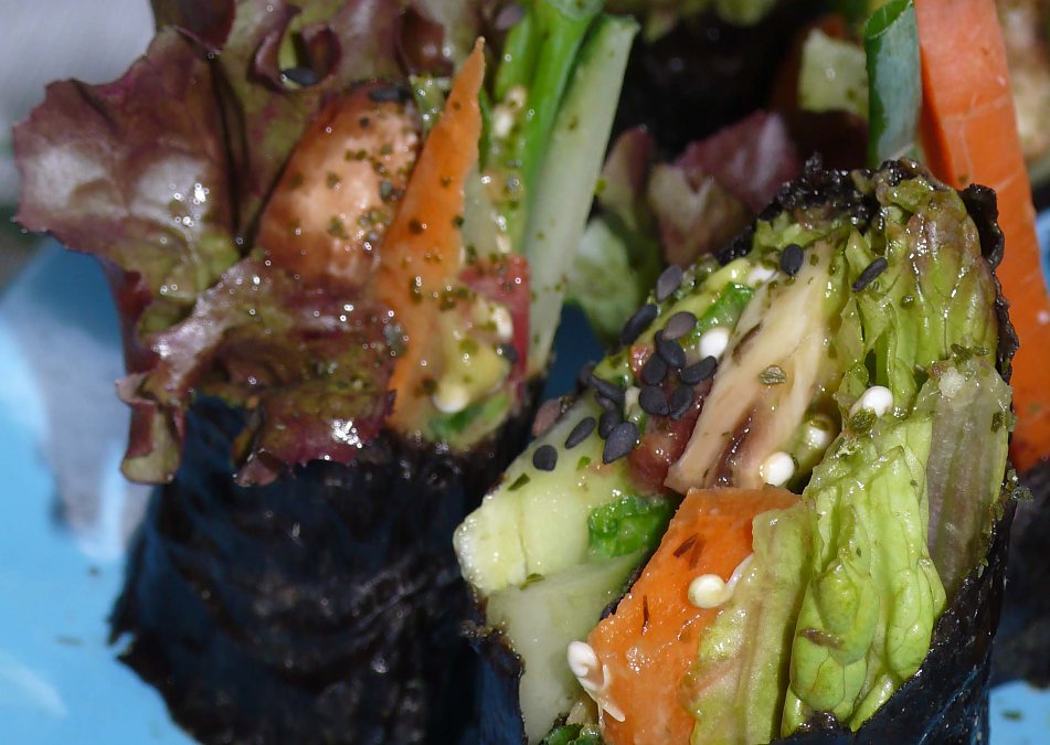 On a sheet of nori, about 1 inch from the edge closest to you, lay down half the carrot and cucumber strips, and two green onions. Let the veggies hang over the sides for prettiness. Carefully plop down the avocado mix on top of the veggies, so that it doesn’t touch the nori. Take the marinated mushrooms and stick them into the avocado mix, along the length of your veggies. Last, take a lettuce leaf and rip into thick strips and lay them down across the mushrooms.