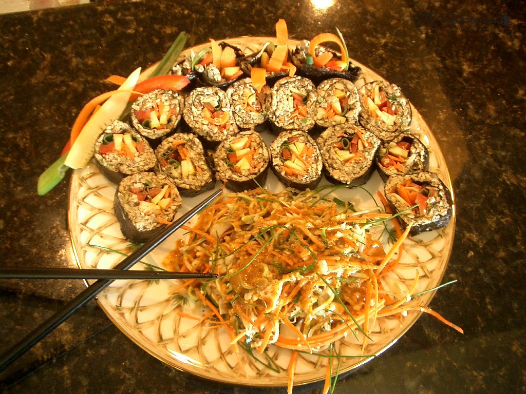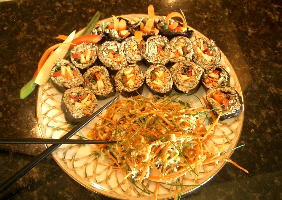 I make similar sushi rolls using pate made from sunflower or pumpkin seeds. After I cut the pieces, I top them with my chutney recipes that are posted on this site. The cilantro and coconut chutney work great. If you like sweet & sour sauce, the tamarind works too.