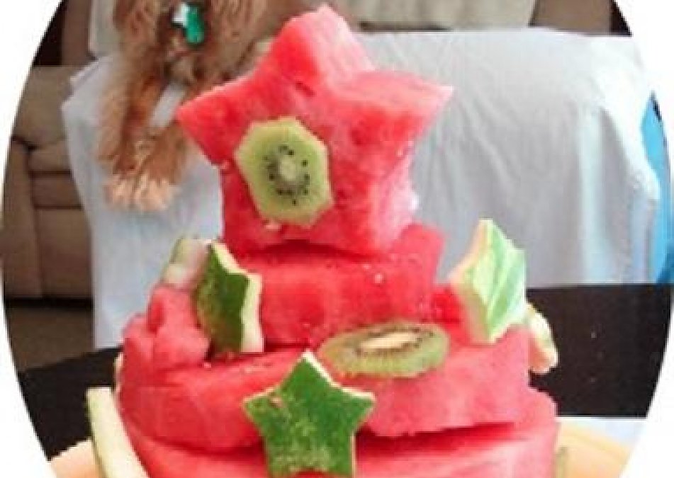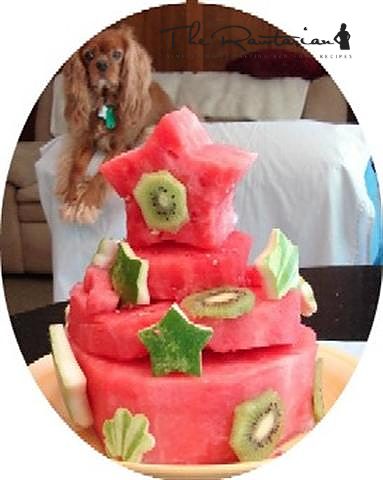 5. The toothpick will hold the other fruit cut outs onto the sides of the cake. Be sure to cut up the scrapes for a fruit tray because no one will want to cut into to the cake.