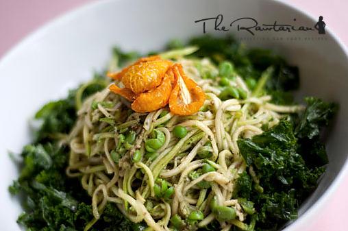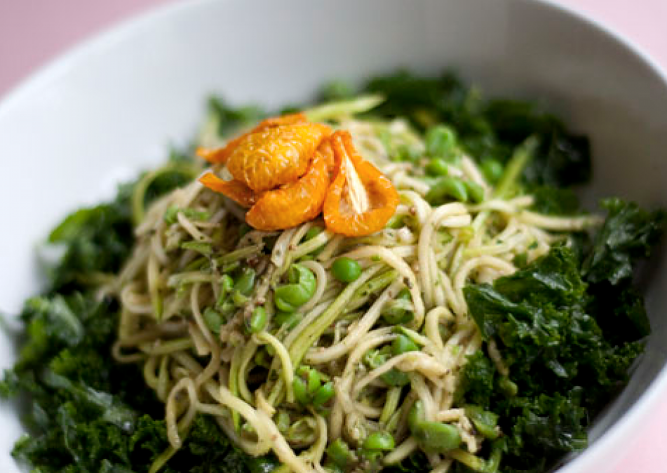 Pea-pesto mixed with zucchini on top of a bed of wilted kale, finished with sun-dried cherry tomatoes.