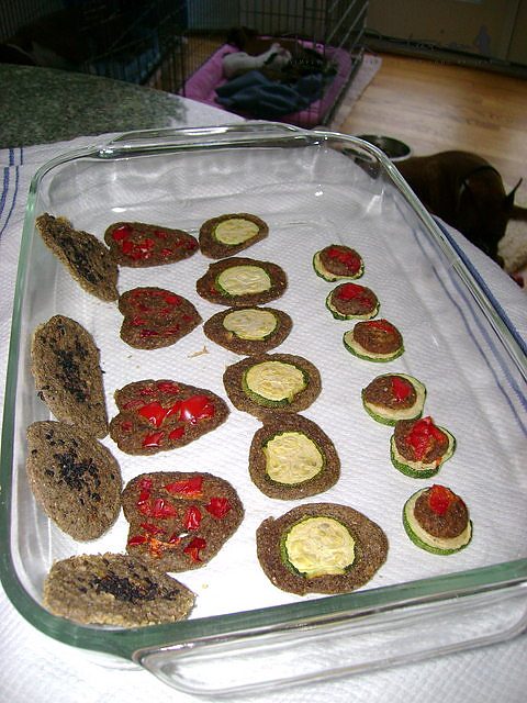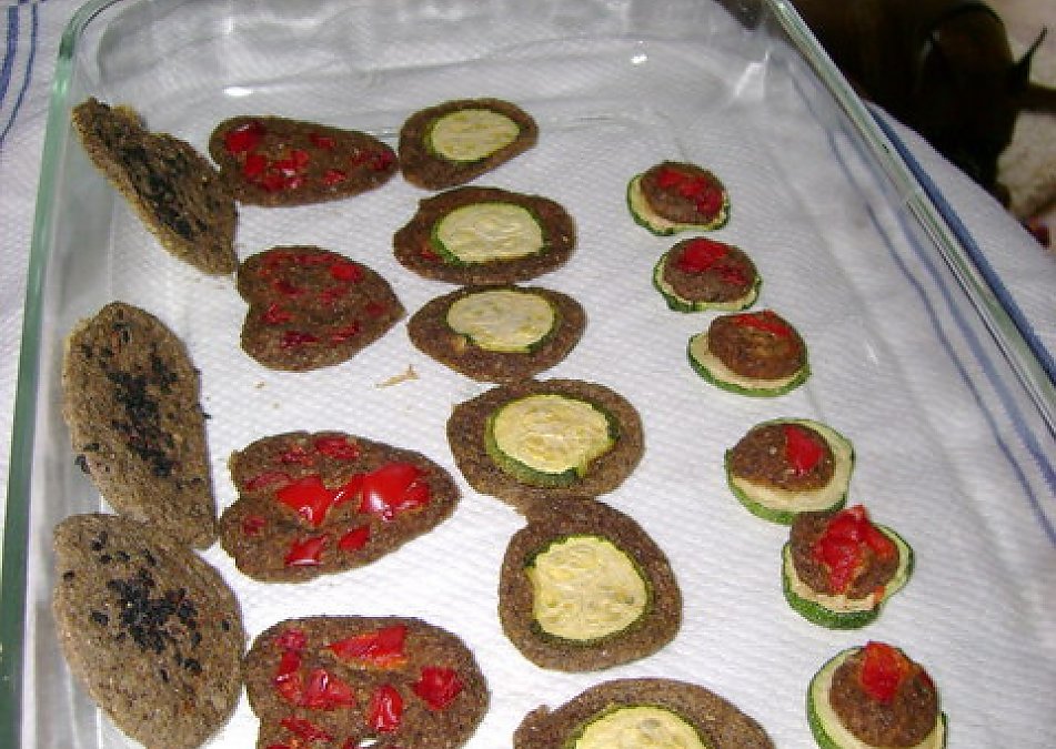 I tried some of these this morning and the crackers were almost done after about 14 hours. The other ones (Zucchini on bottom) were a lot softer and could be eaten like “sausage” – warm in the morning.