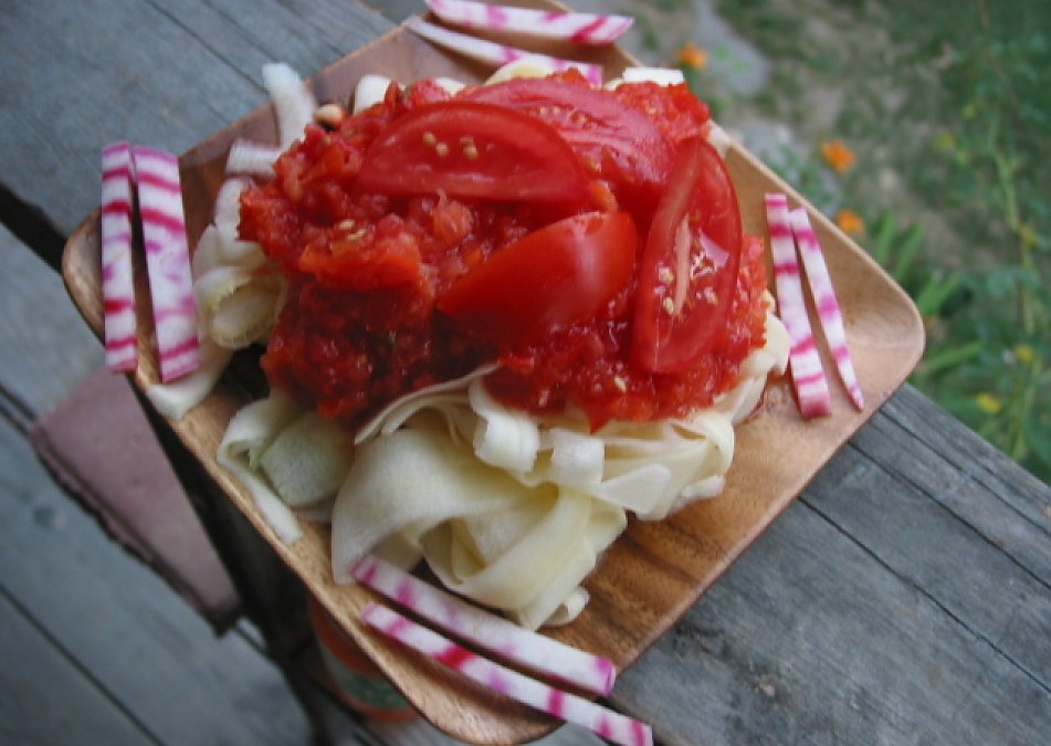 In a food processor, blend half of a red or yellow bell pepper with three medium tomatoes, resulting in a thick marinara. Pour marinara over zucchini. Slice thin rounds of chiogga beets and cut into matchsticks for garnish. Slice the remaining tomato into quarters and place artfully atop the marinara.