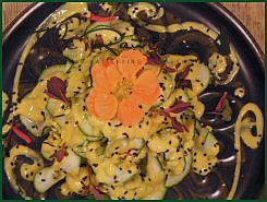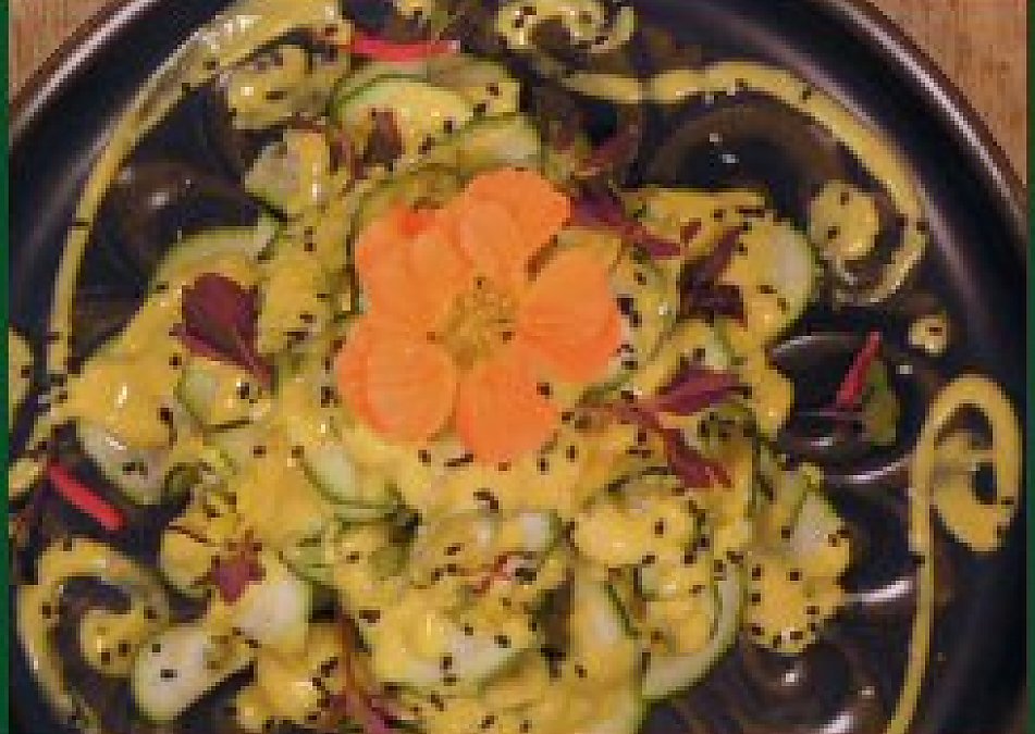 3. Top the zucchini noodles with sauce and garnish with chopped mint leaves and sesame seeds.