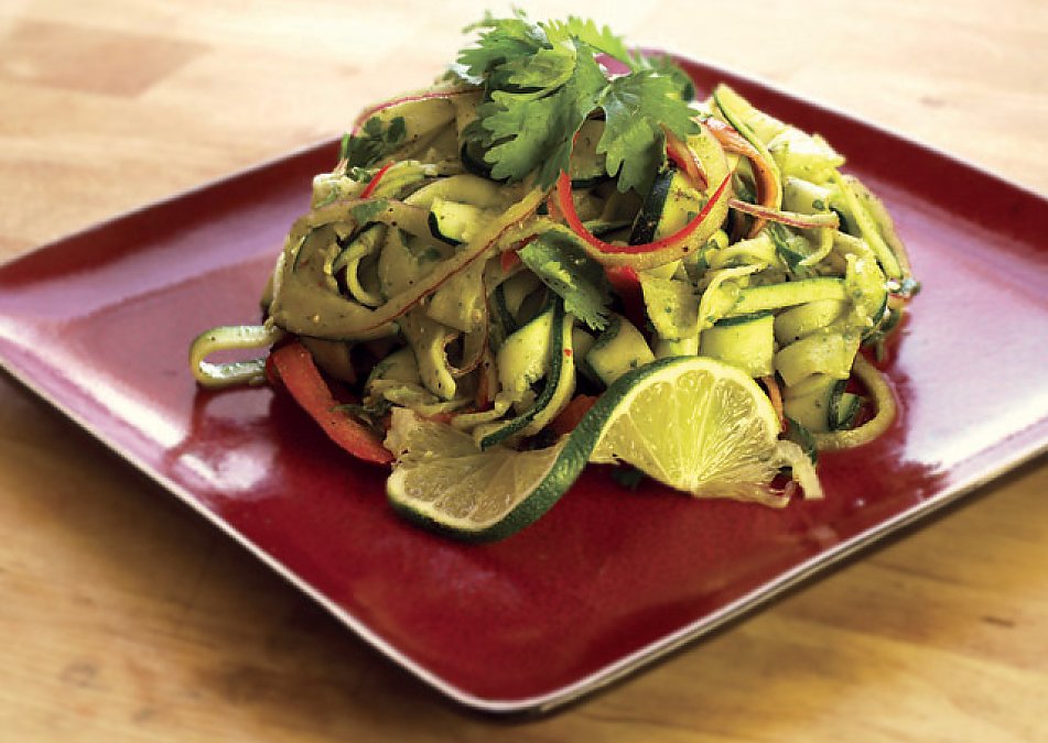 3. Coarsely mince the reserved cilantro and mix into the pesto. Pour onto the ‘pasta’ and toss to coat.