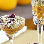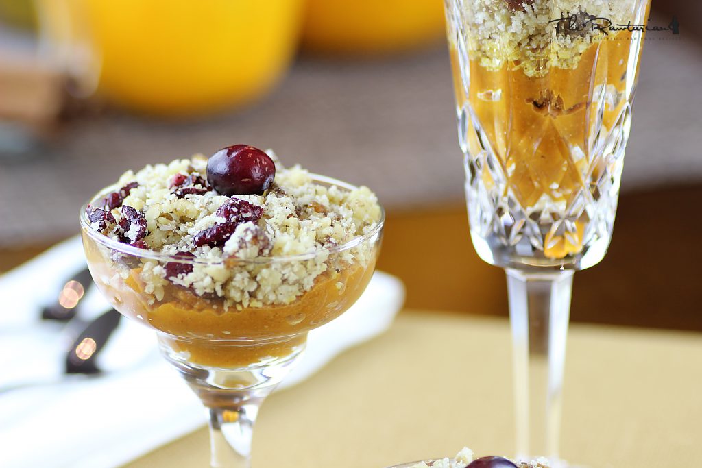 This recipe is fast and easy. Blend all pumpkin filling ingredients in a blender and set aside. Next, briefly process coconut, pecans and salt, then add your dates and continue processing until the crumble mixture turns into a fluffy coarse meal. To avoid it getting soggy, always store the filling and the crumble separately until it’s ready to eat. Add dried cranberries to the crumble for a more festive touch.