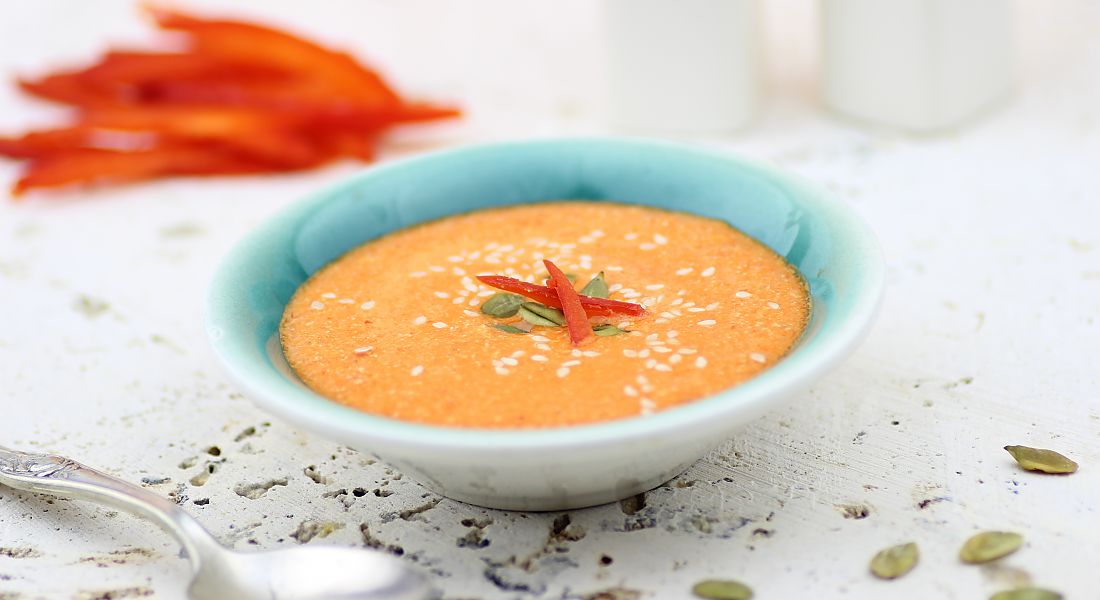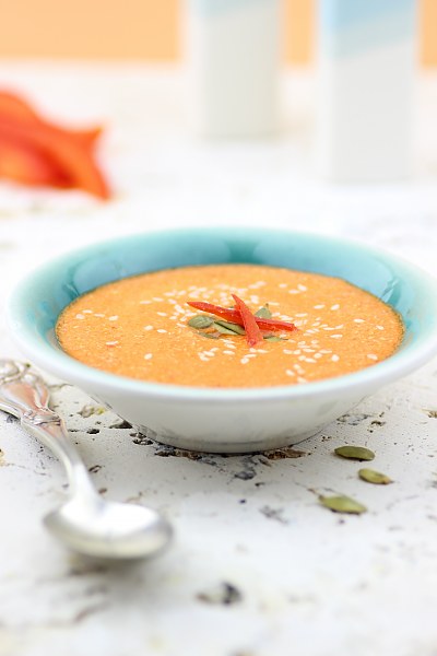 This raw red pepper soup uses cashews as the cream base. It tastes surprisingly like traditional red pepper soup - but without the dairy. A blender is required.