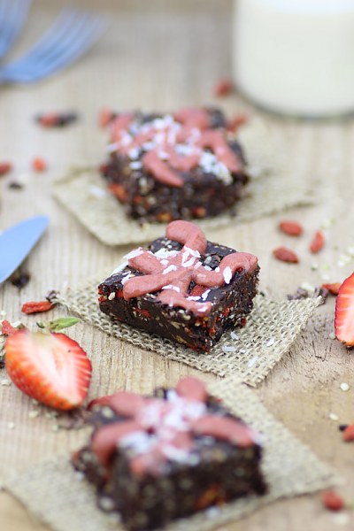 This is a pretty easy raw superfood brownie recipe. Just process most of the ingredients in a food processor, then mix in the goji berries, hemp hearts (and optional additional sweetener) by hand....