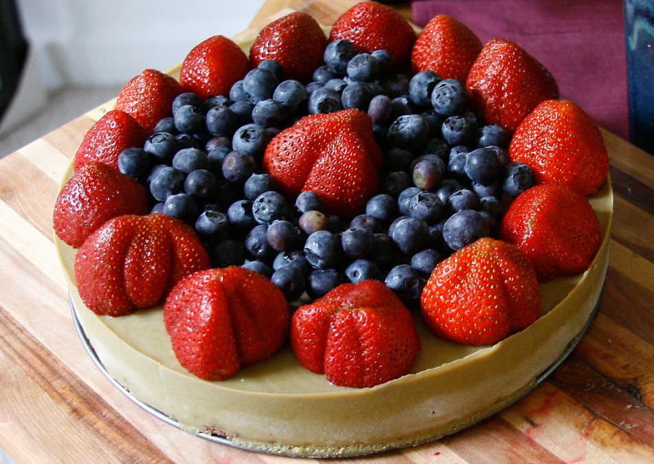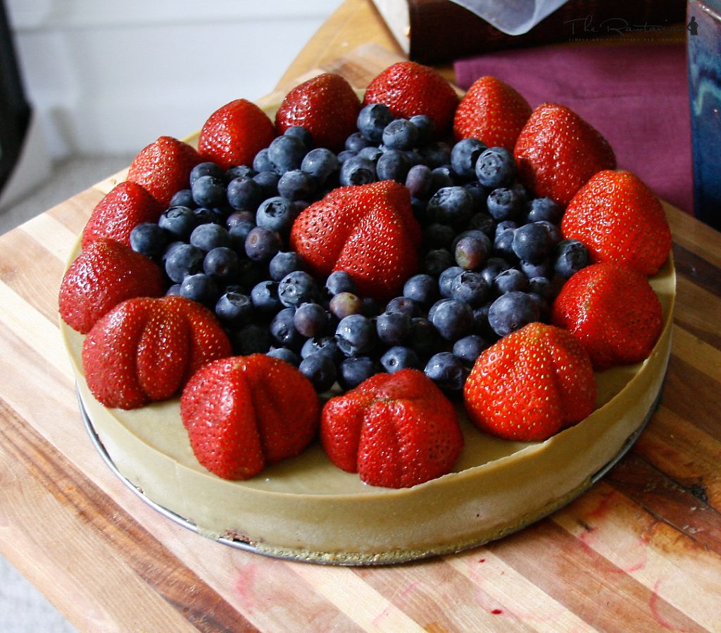 4. Before pouring filling on top, line the crust layer with strawberry slices.