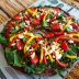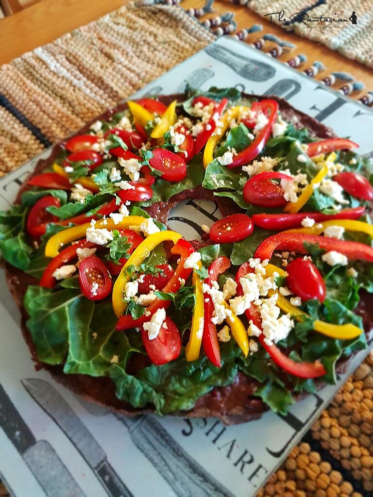 Rawlicious pizza topped with raw pesto, spinach, papers and tomatoes. Yummy!