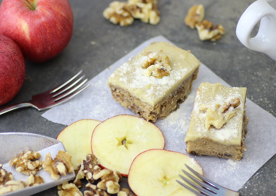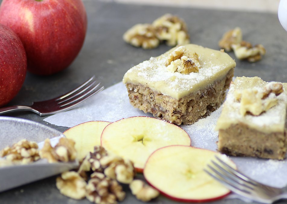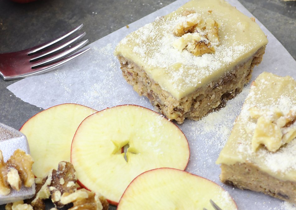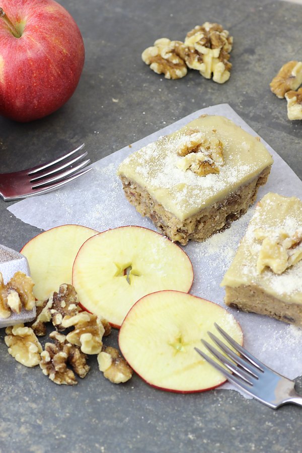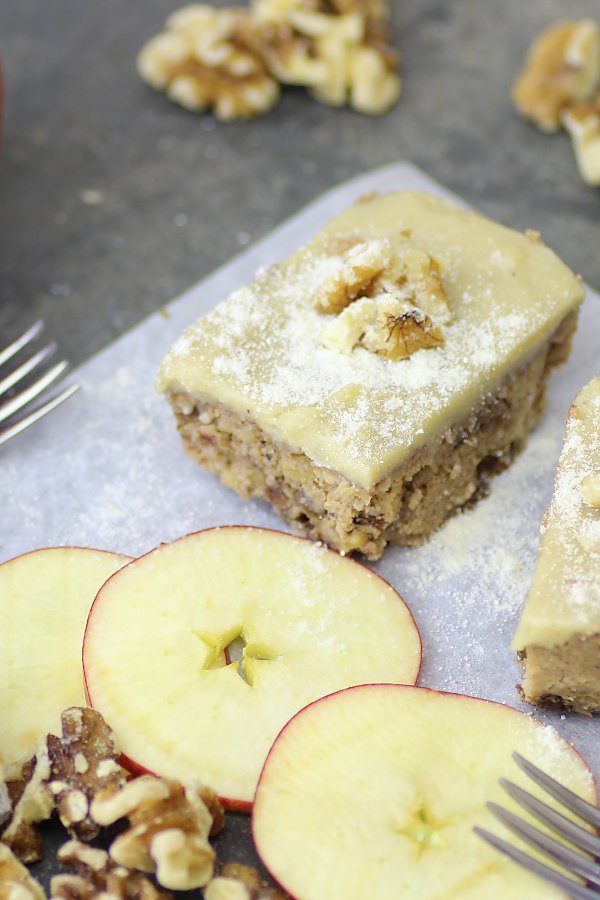- 6. Refrigerate your raw apple walnut cake for at least two hours. The cake and the icing will both harden up a bit in the fridge.
