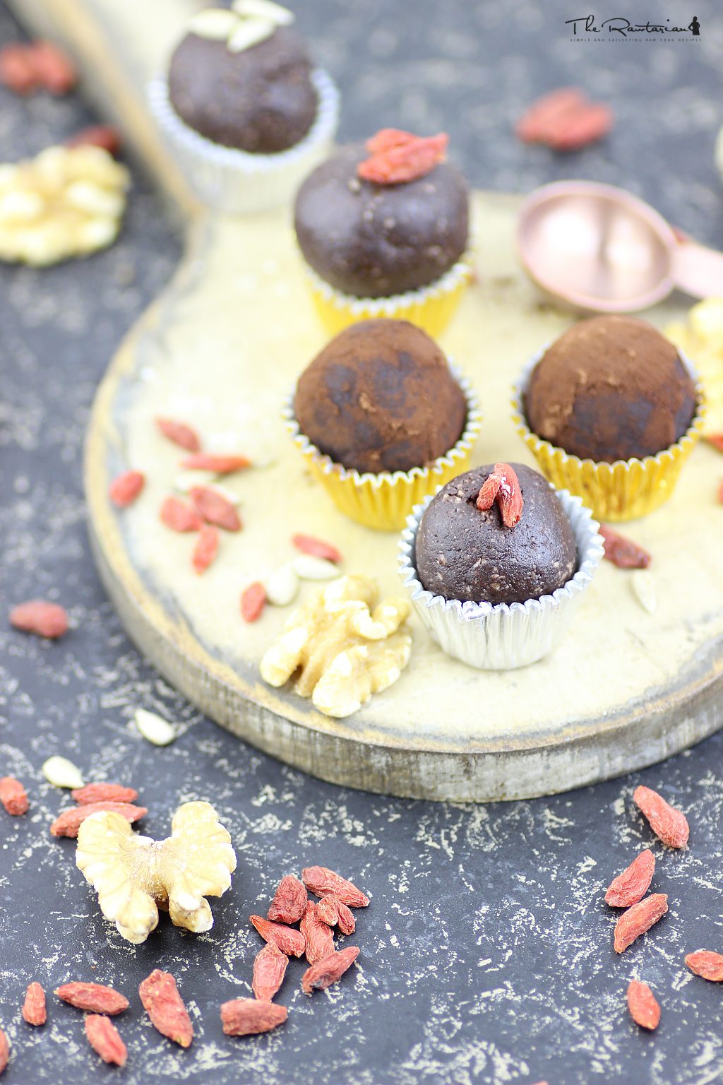 These simple little raw chocolate truffles taste just like the real thing. Dates, walnuts, cacao, seeds and salt combine in a food processor. Roll them in cacao or dried coconut for extra pizzazz. Garnish with goji berries for added color.