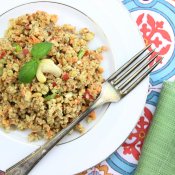 Simply process (for a few seconds) all the ingredients – sunflower seeds, cashews, pecans, cucumber, red onion, apple, celery stalk, fresh or dried dill, lemon juice and sea salt together into chunky bits. Don’t process for too long! You may want to let the flavors combine by leaving it for about half an hour, but it’s best to consume it immediately because it doesn’t keep well. You’re right; this recipe is pretending to be chicken meat even though it doesn’t taste like chicken. But the texture is just like that of a chicken salad.