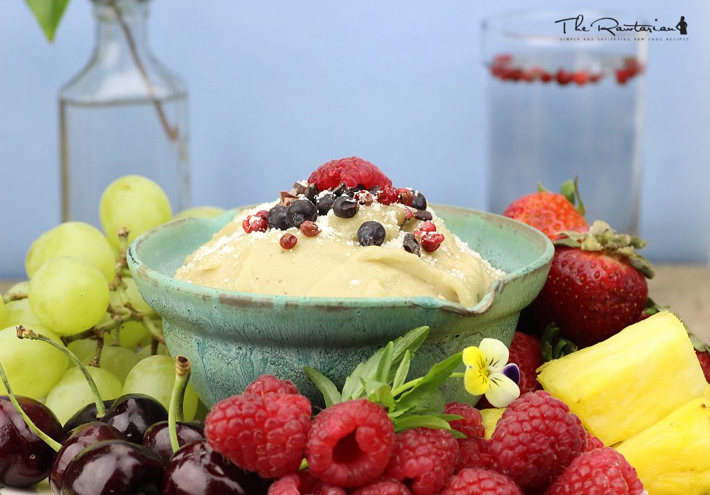 By The Rawtarian This raw fruit dip is total comfort food for me. It's the same texture as cream cheese icing, which I used to love... Creamy and almost tangy, mmm!
