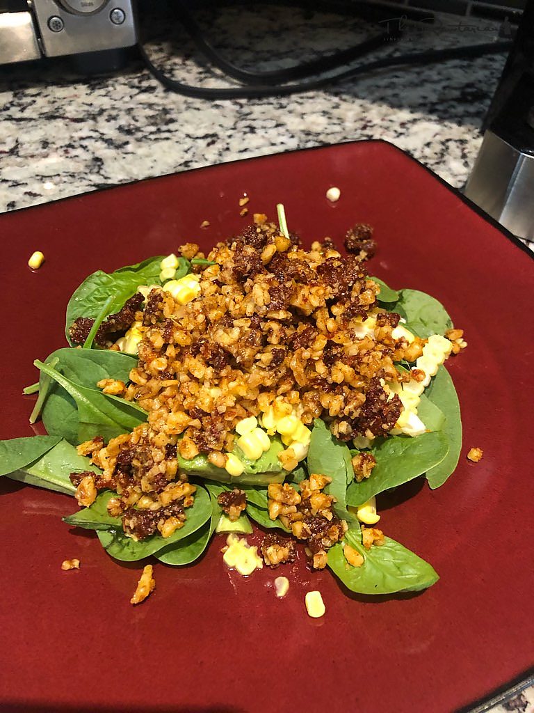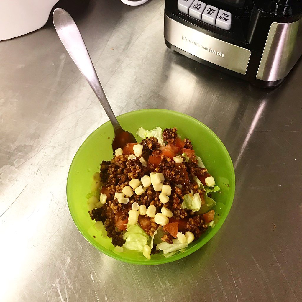 This taco salad is so satisfying. I love Mexican food. I make a huge salad with lettuce, spinach,tomatoes, cuke, onion,and then top it with some raw corn ,avocado, cilantro, and of course the taco "meat". Yum.