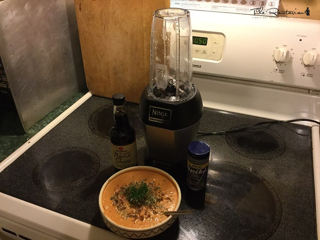 Just added this photo to showcase the soup and my upgraded “blender,” the Nutri Ninja, 900 Watts extractor blades, noteworthy because I was able to warm up the soup with its blades (great for cold days ahead), the texture of the soup (liquidy, creamy...ah, just right, perfectly smooth... mm-mm), super fast to clean (unscrew the blade lid, rinse ... rinse cup... done ?), and it cost about $70 (not bad considering the Vitamix costs quadrupally more... and now I can finally benefit way more from Laura-Jane’s awesome recipes as well as stick to a raw food lifestyle. Best investment I’ve made in awhile. It’s better than a blender, it’s a blender and juicer combined, and zero nutrients are lost with this Pro. hallelujah!!!